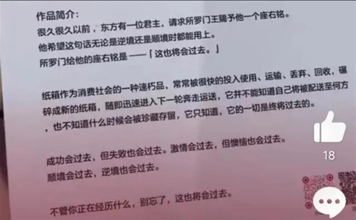 废纸箱在很多人眼中,可能就是回收用的,能变现几个钱。在美术生眼中,废纸箱是消费社会速朽品的代表物。他们看待物品的视角不同。这只是一件正常的展品。所以,作者又没做错什么,没必要致歉。
